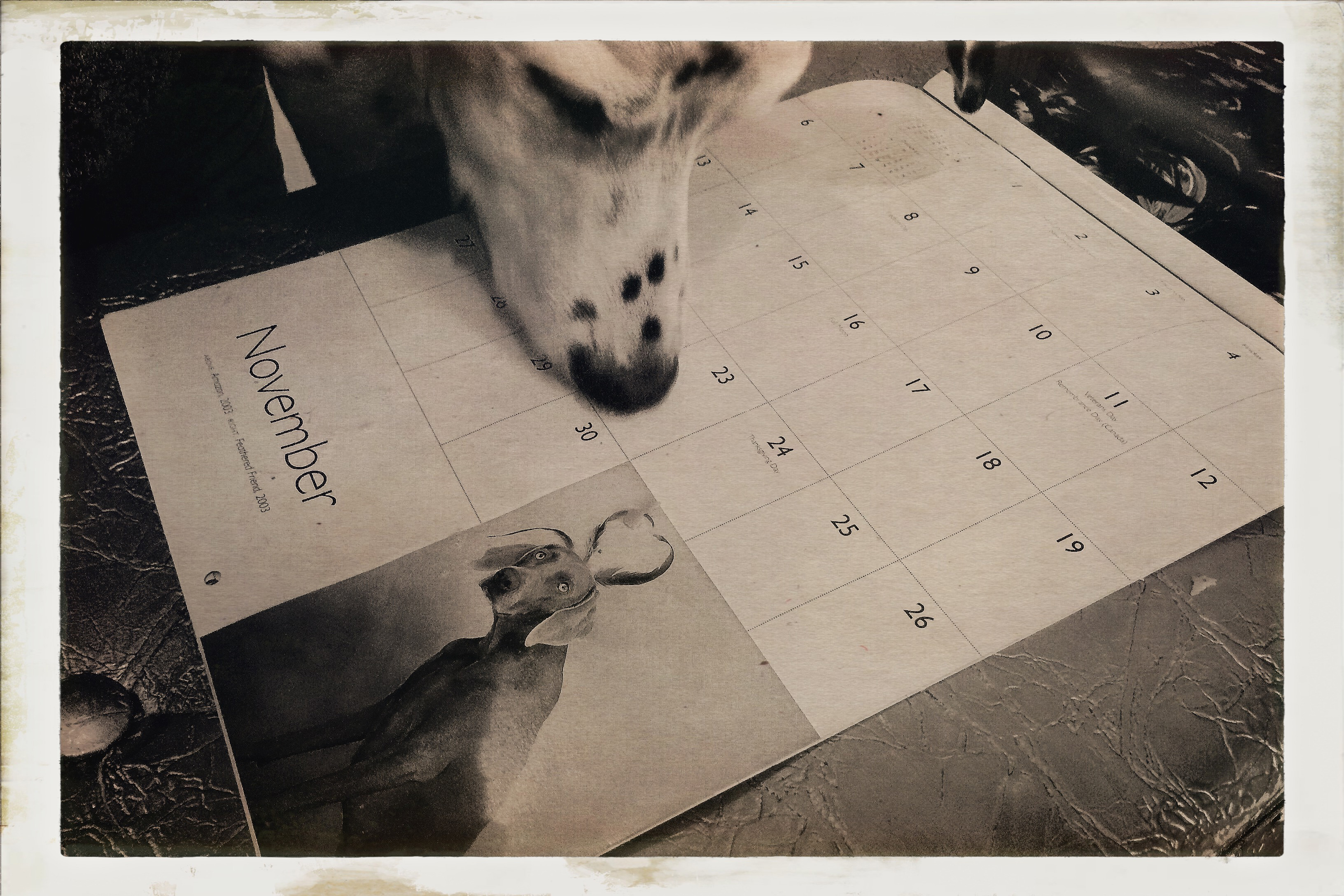 Sadly, a little over a year ago, one of our original pair passed away but Leica is still here and the other day saw her fourteenth birthday. Here she is, checking out a William Wegman calendar featuring one of his dogs, “Fay Ray” who as it happens, shared the same November birthday. Wegman and I share the same birthday too coincidentally, albeit separated by a few years. Fay, like Wegman’s other dog “Man Ray” is long since gone but their lives were recorded and remembered in books, calendars, short films and exhibitions.